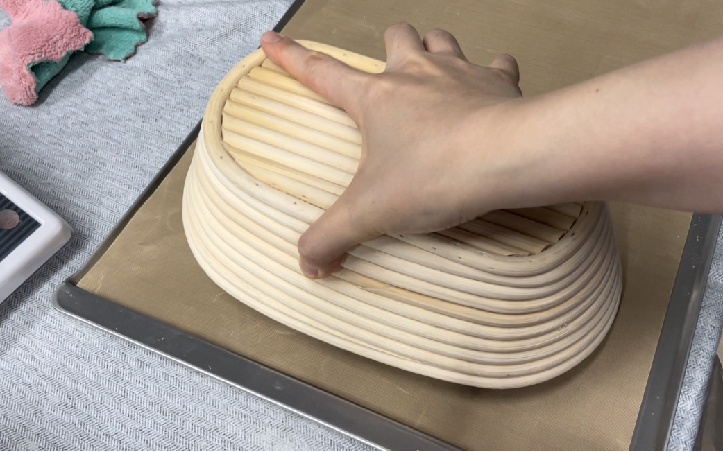 8. 휴지한 반죽은 가스를 빼고 둥글려서 덧가루 넉넉히 뿌린 반느통에 매끄러운면이 아래로 가게 넣어줍니다.