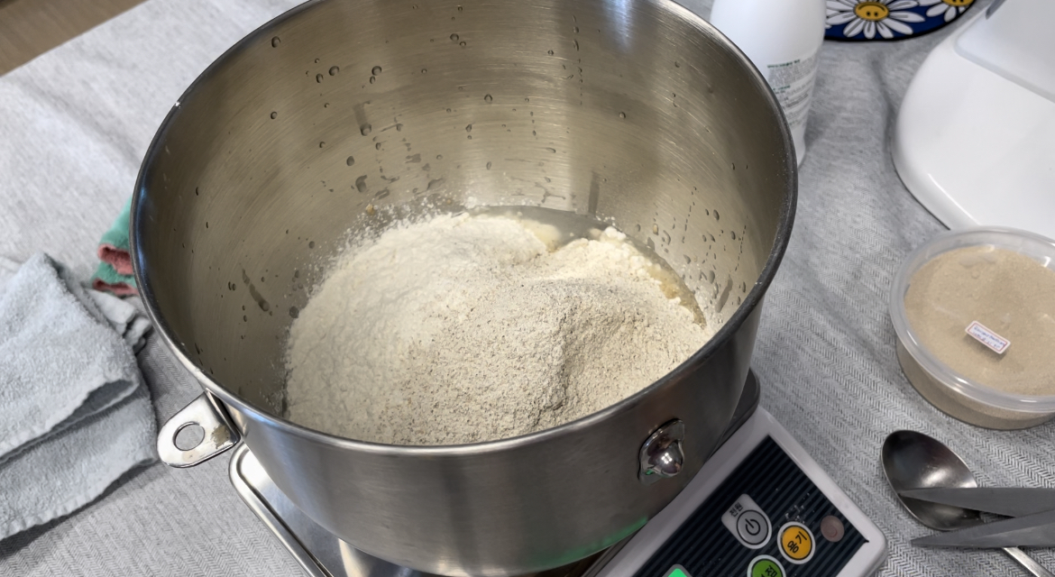 2. 반죽기에 강력분, 호밀가루, 드라이이스트, 물, 폴리쉬반죽을 넣고 저속으로 날가루가 날리지 않게 돌리다가