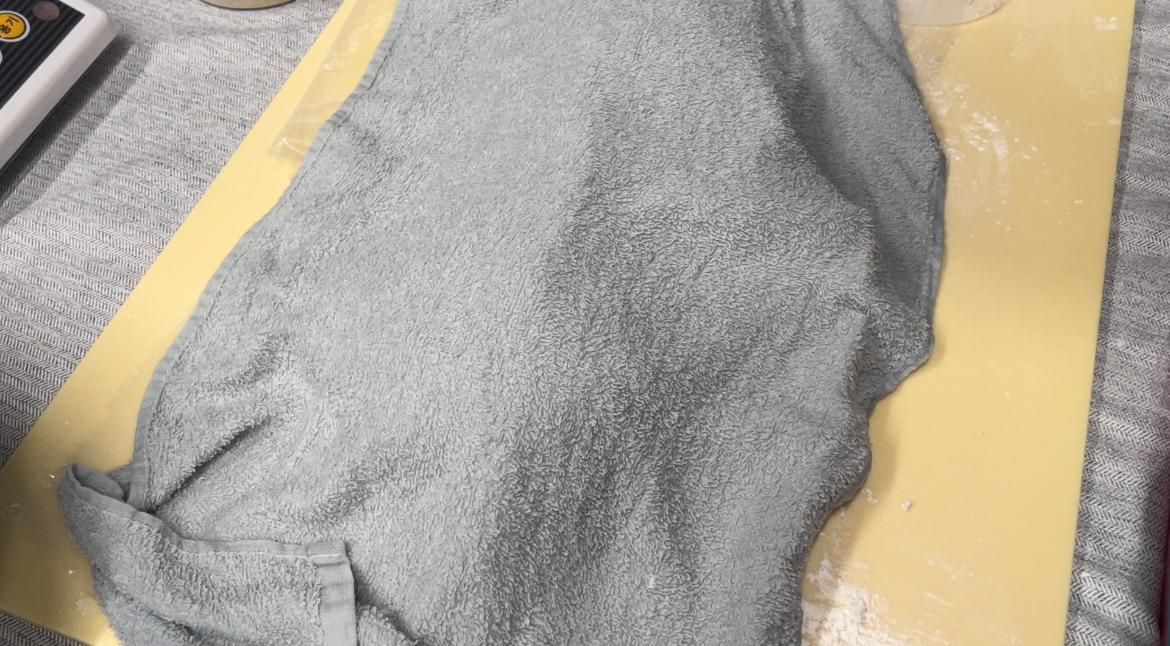 7. 반죽이 두배로 부풀면, 두 덩이로 나눈 후 비닐덮고, 젖은 면보(따뜻한) 덮어서 15-20분 휴지