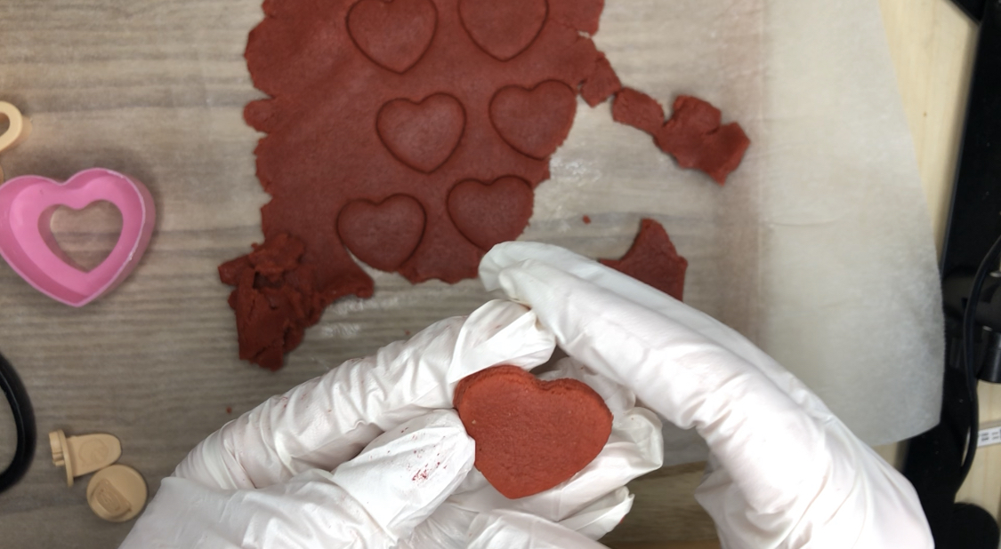 12. 남은 반죽덩어리에 빨강식용색소를 입히고, 하트모양쿠키를 만들어줍니다.
