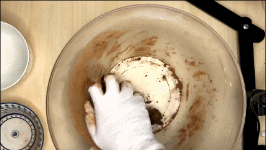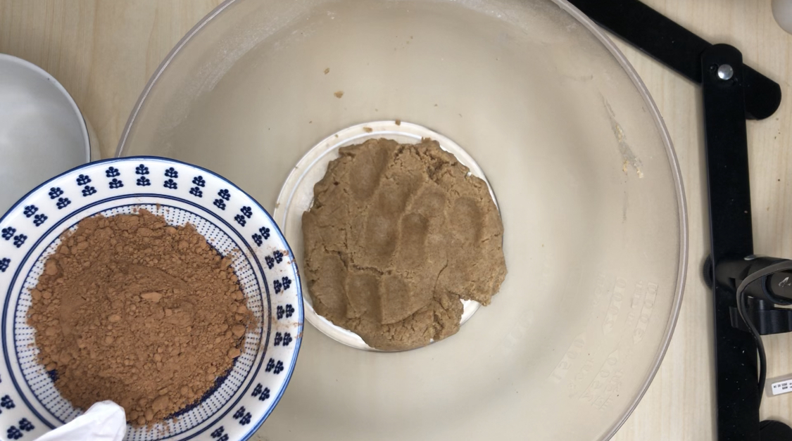6. 반죽을 두덩이로 나눠서 한쪽엔 코코아가루를 넣고 주걱으로 섞다가 손으로 뭉쳐줍니다.