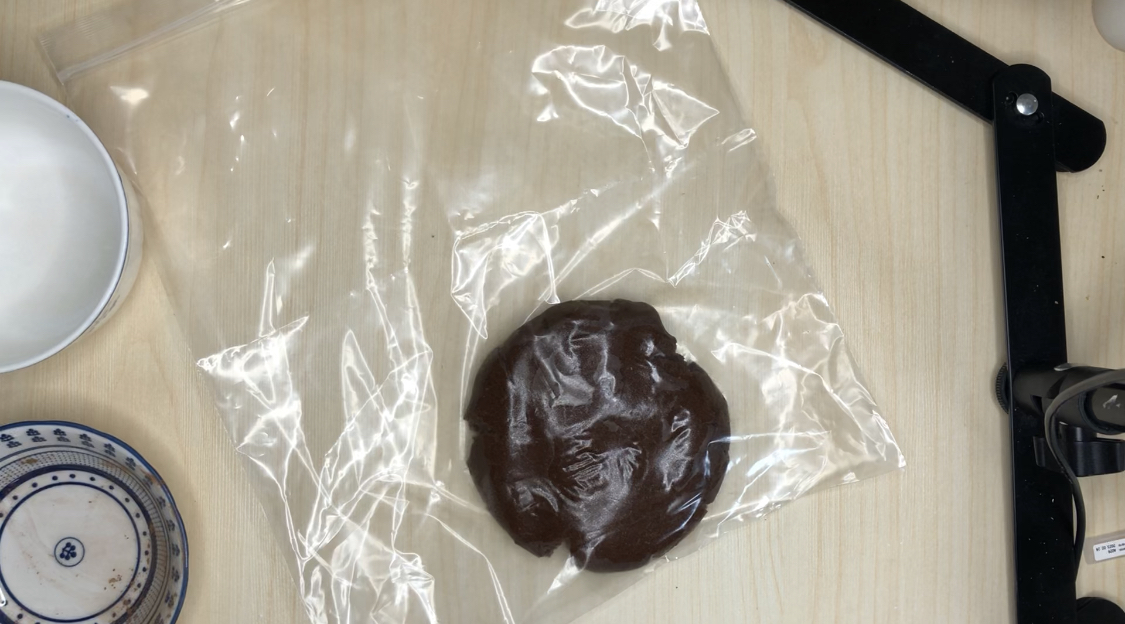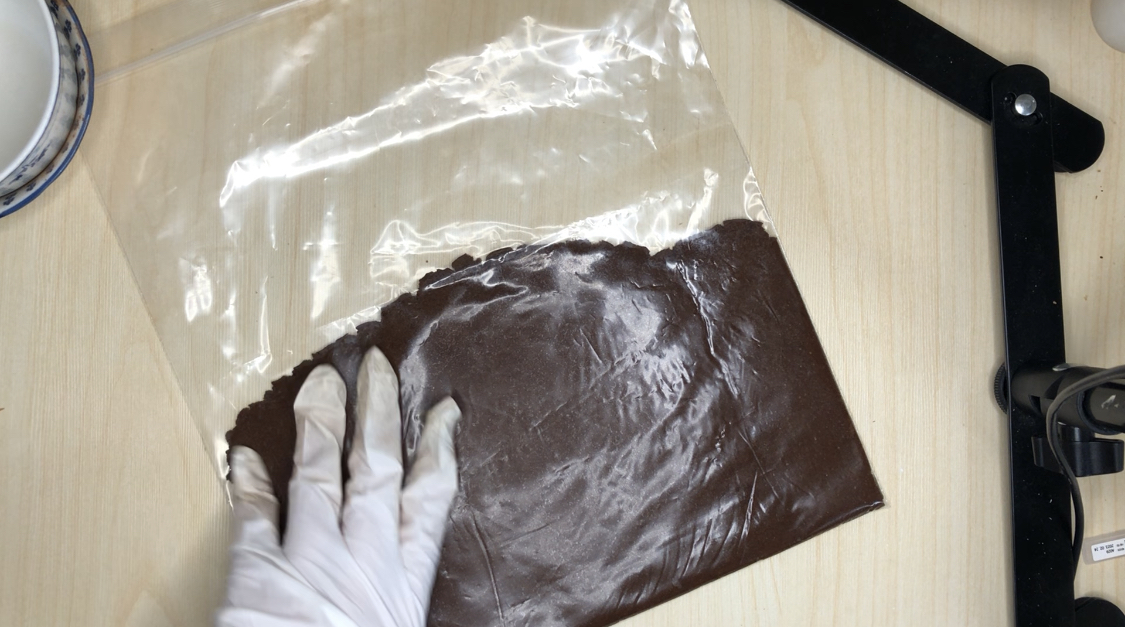 7. 비닐팩에 반죽을 넣고 밀대로 밀어줍니다. (다른 덩어리도 반복)