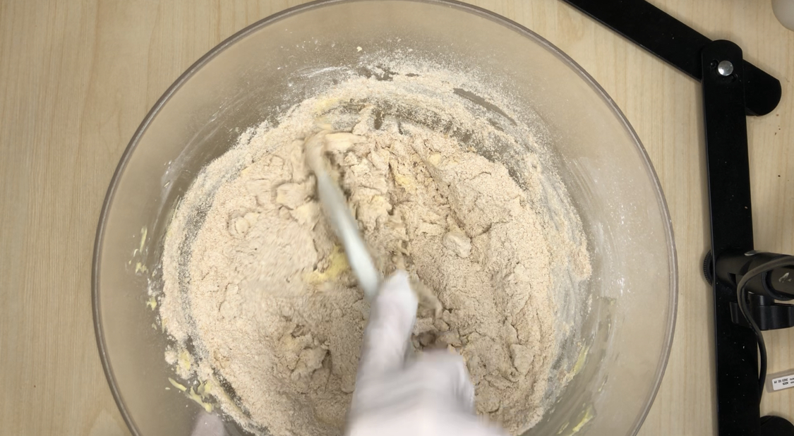 4. 통밀가루, 베이킹파우더를 체쳐서 넣고 주걱으로 11자를 그으면서 섞어줍니다.