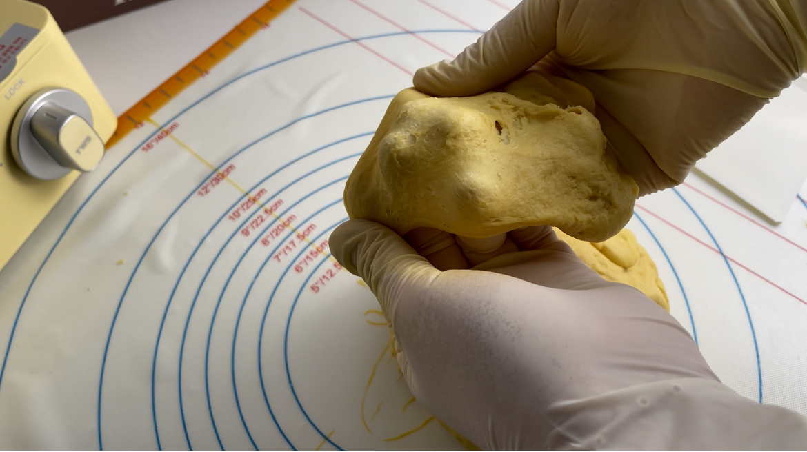 6. 반죽을 조금 떼어내서 늘려봤을때 살짝 막이 생기면서 뚝뚝 끊어지는 상태 확인