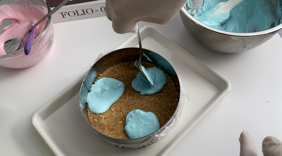 10. 무스틀에 숟가락으로 색깔별로 겹쳐서 올려줍니다.