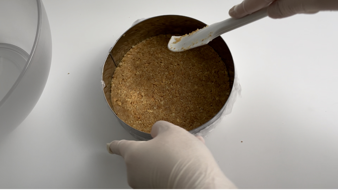3. 무스틀에 잘 섞은 통밀쿠키를 넣고 주걱으로 눌러줍니다.