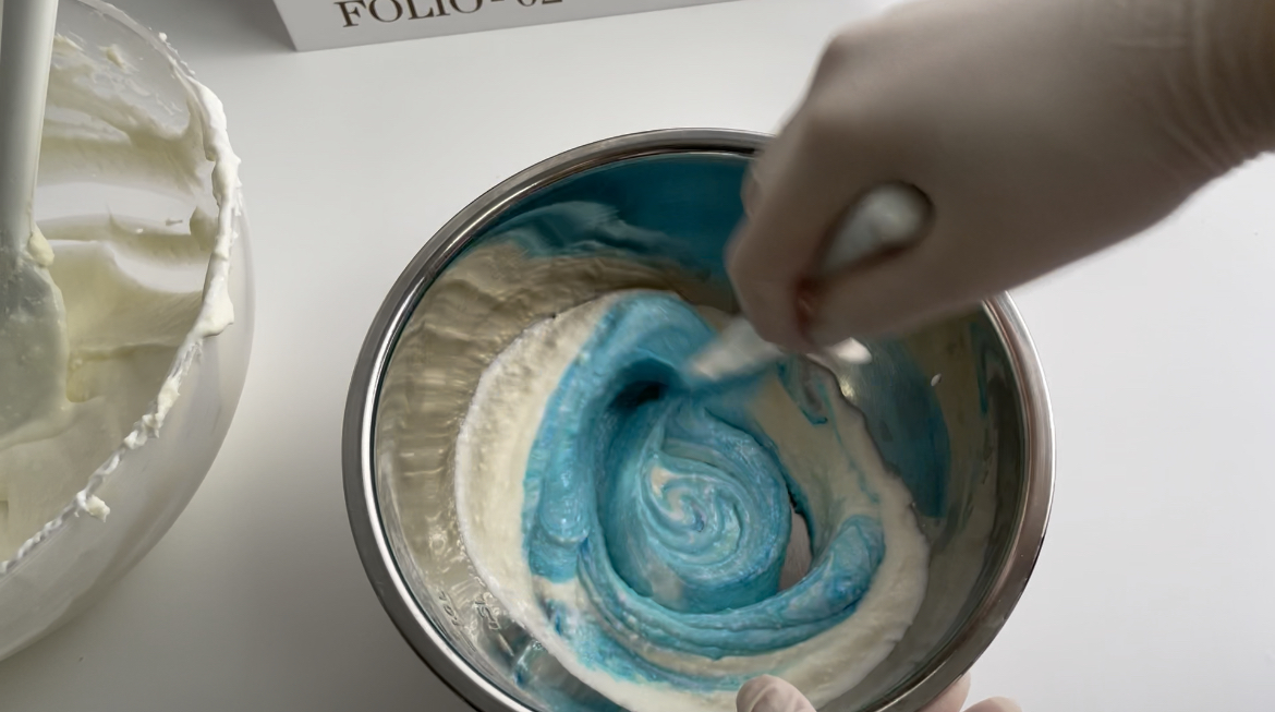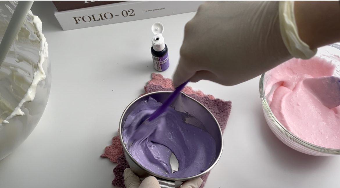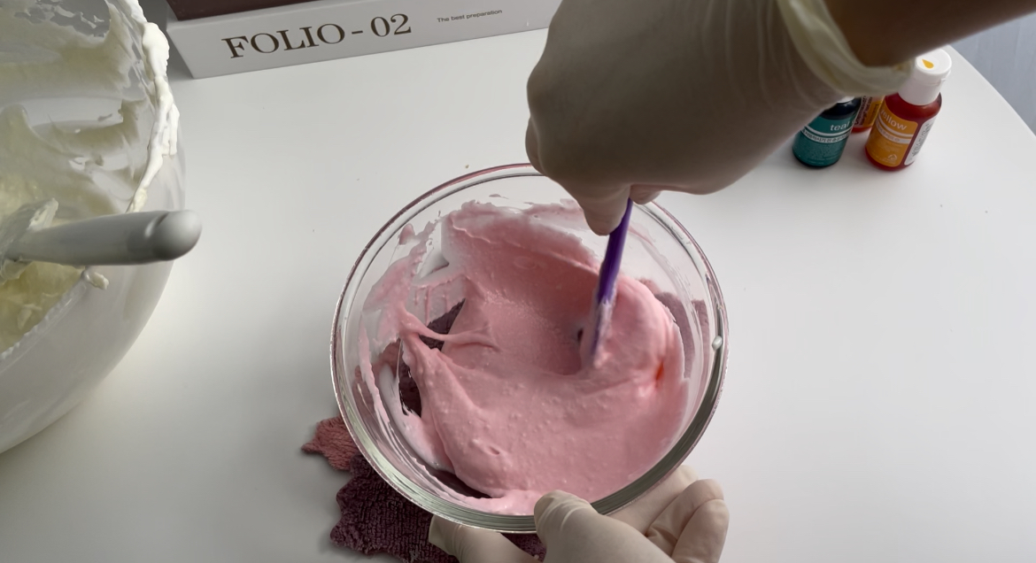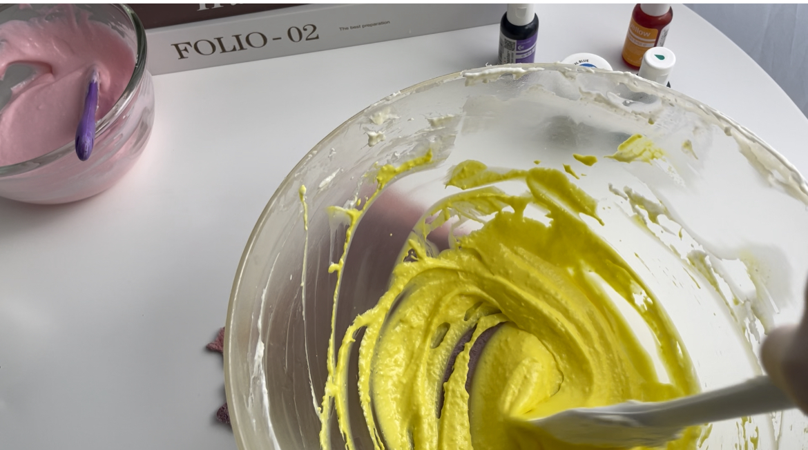 9. 반죽을 몇 개로 나눠서 통에 담고, 식용색소를 넣고 섞어줍니다.