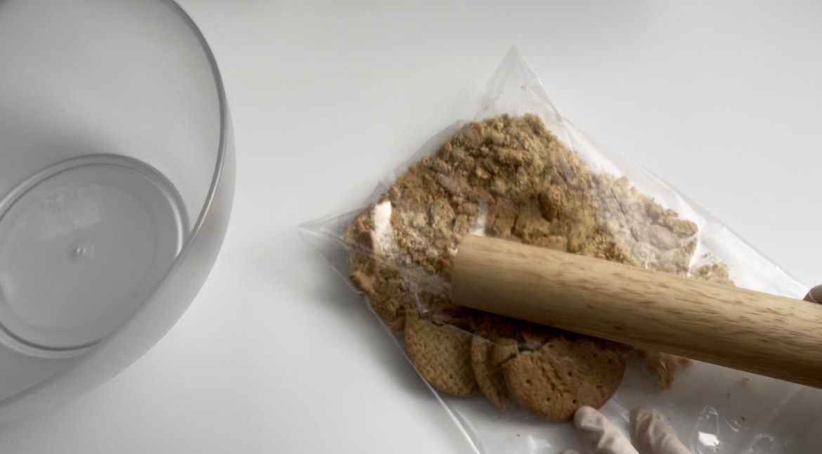 2. 통밀쿠키를 잘게 부수어주고, 녹인버터를 넣고 잘 섞어줍니다.