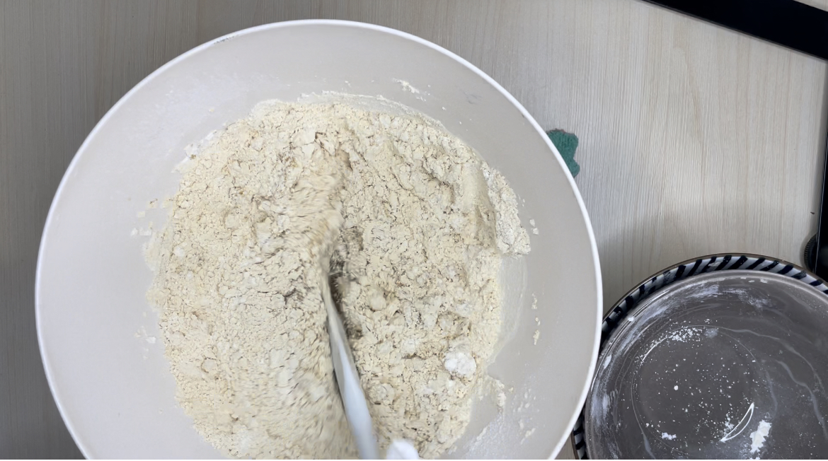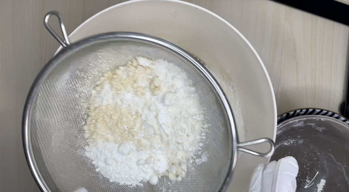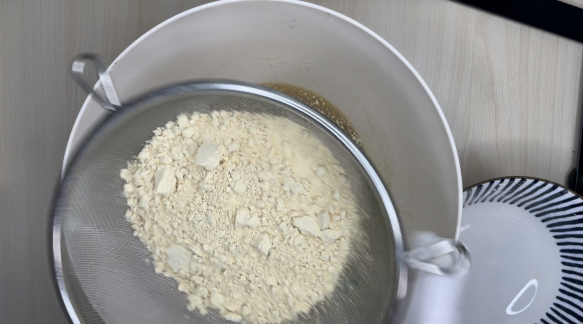 3. 콩가루 + 박력분 + 아몬드가루 + 베이킹파우더를 체쳐서 넣고 주걱으로 11자를 그어가면서 섞어줍니다.