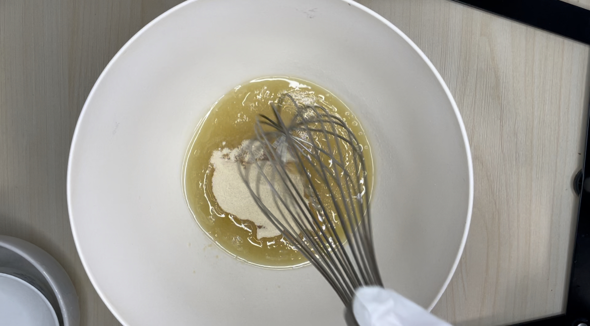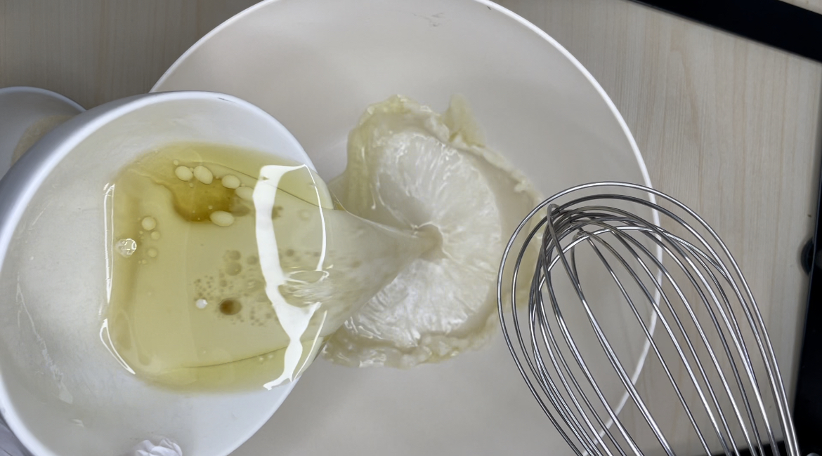 1. 식물성오일 + 아몬드브리즈 + 알룰로스 + 소금 한 꼬집을 넣고 휘퍼로 잘 섞어줍니다.