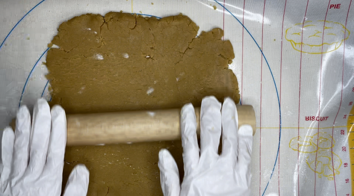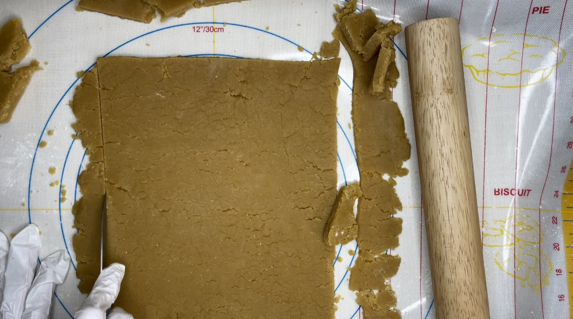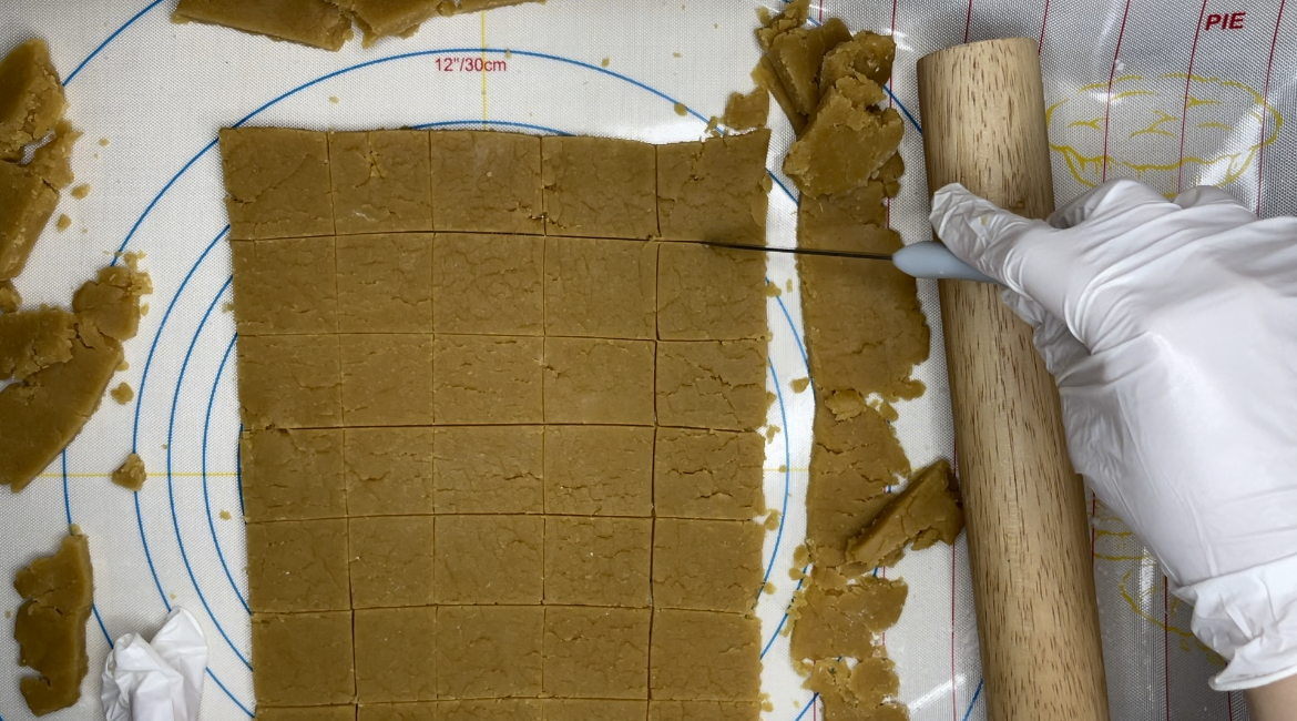 6. 꺼내온 반죽을 밀대로 밀어펴고 적당한 크기로 잘라줍니다.