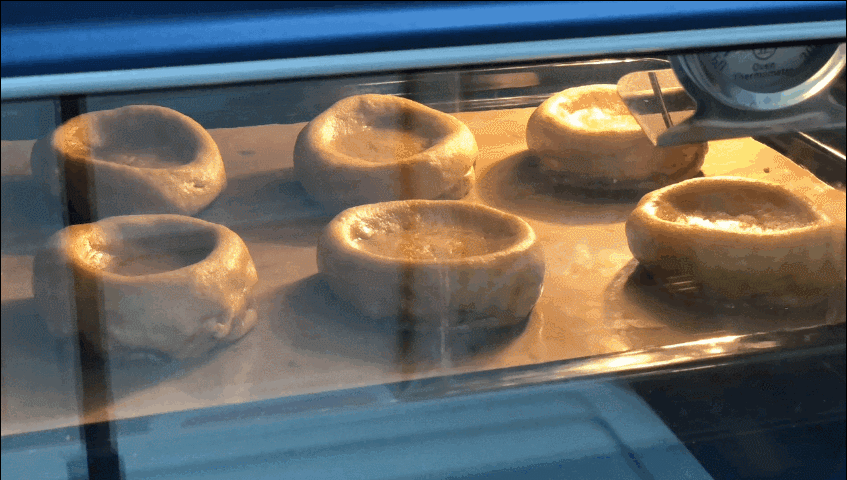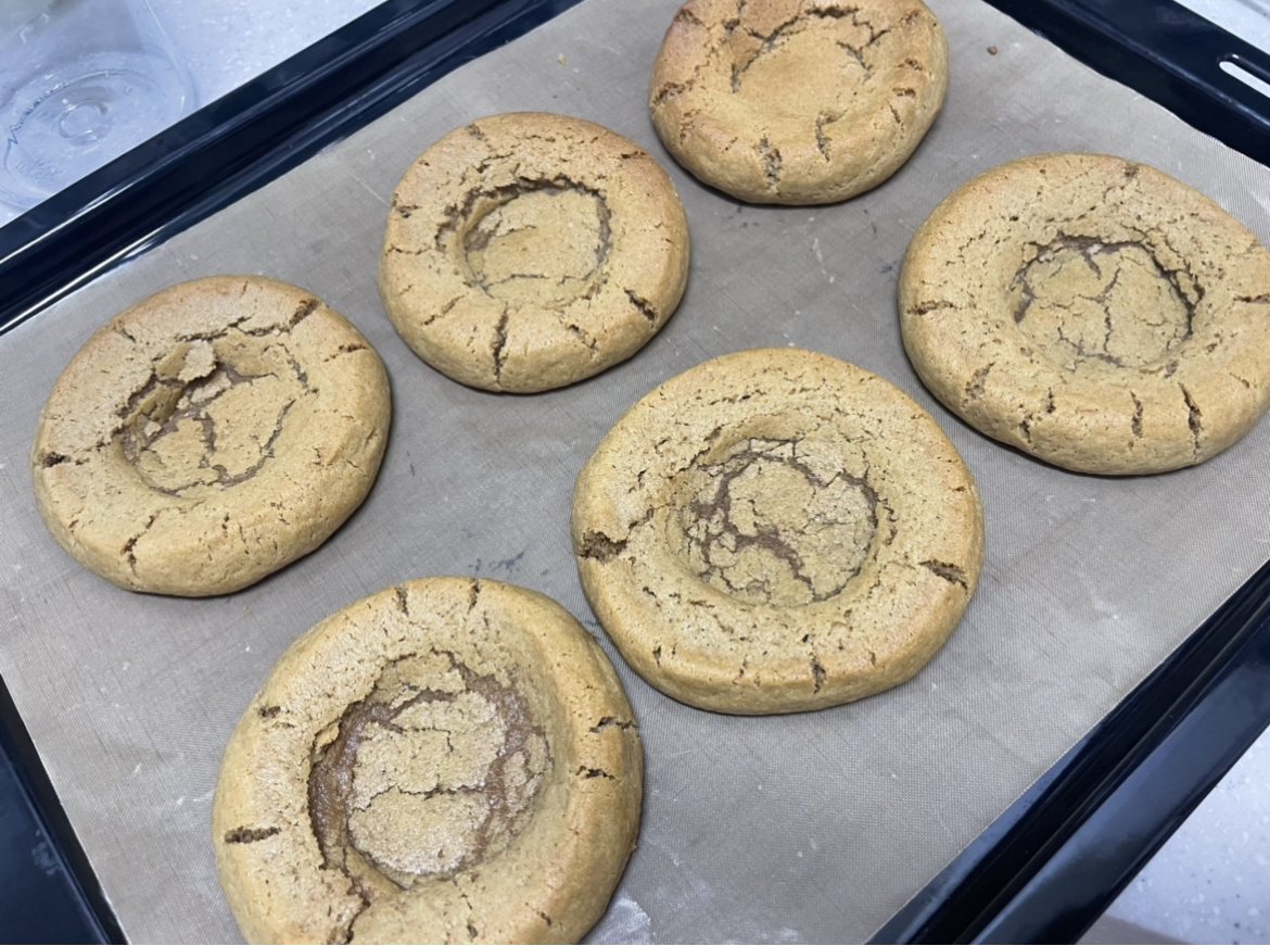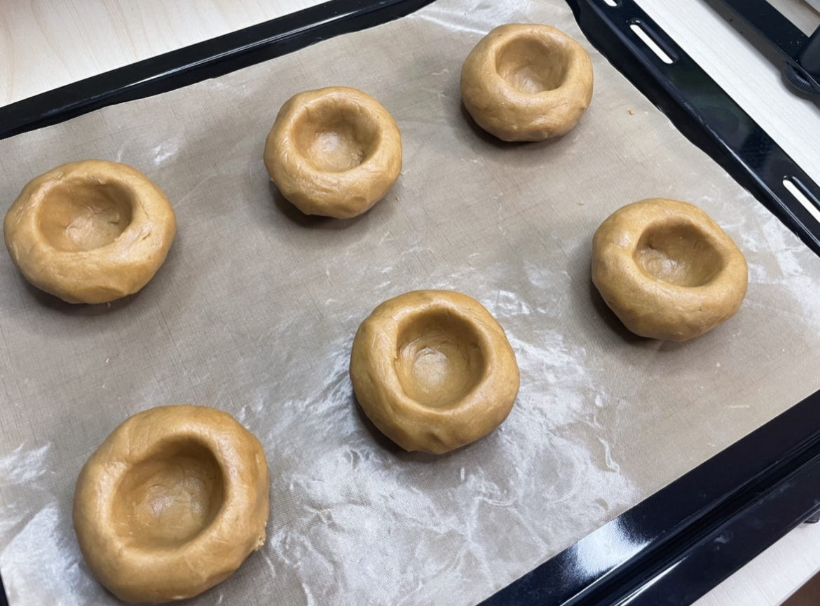 9. 오븐에서 꺼내서 숟가락으로 가운데 필링 들어갈 부분을 눌러줍니다.