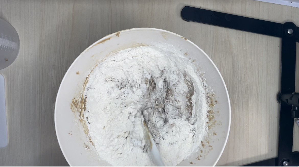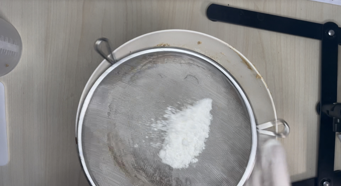 4. 중력분, 베이킹소다, 베이킹파우더를 체쳐서 넣어주세요.