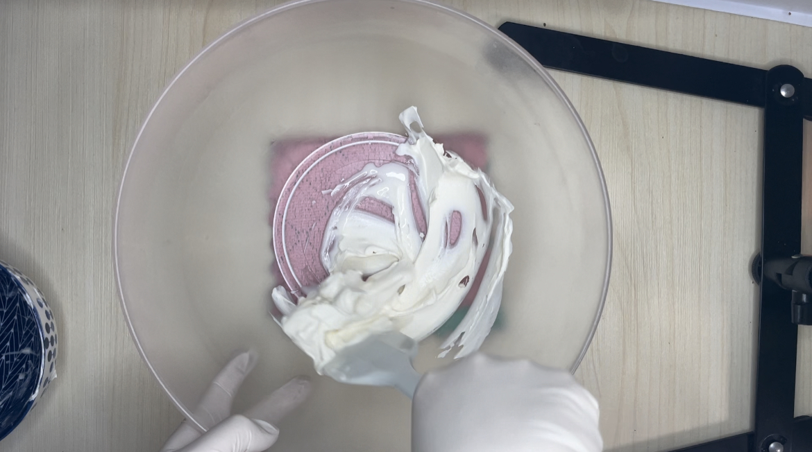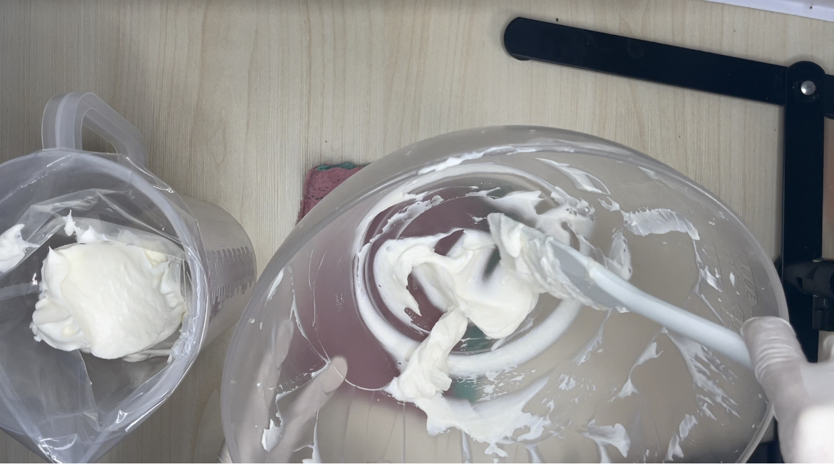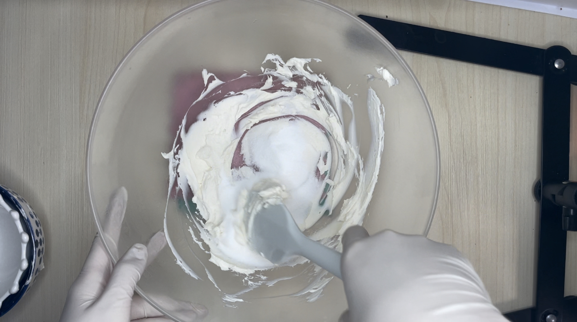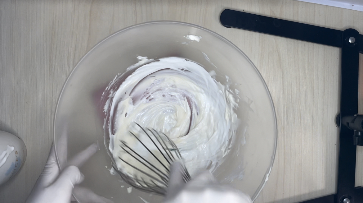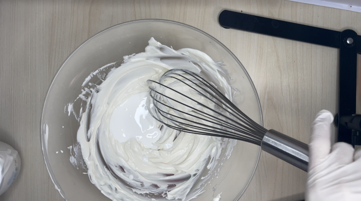 3. 생크림을 2-3번에 나눠서 넣고 휘퍼로 잘 섞어줍니다.