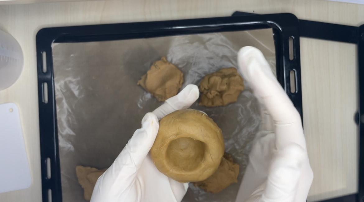 7. 반죽을 6등분으로 나눠서 동그란 모양에 가운데엔 필링 공간을 만들고 팬닝해줍니다.