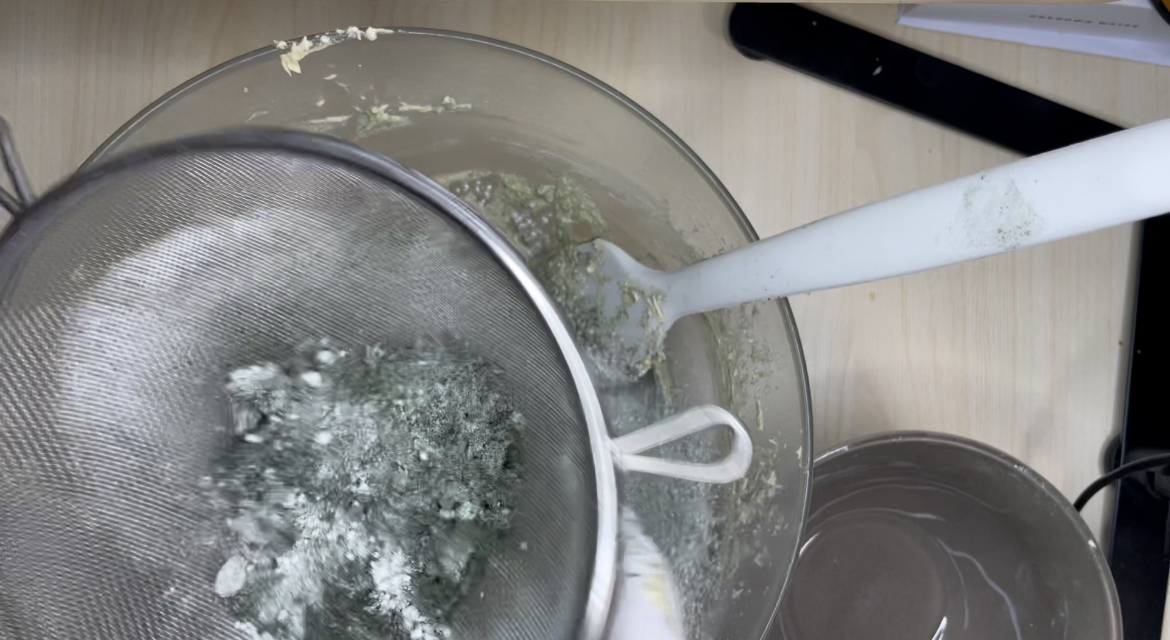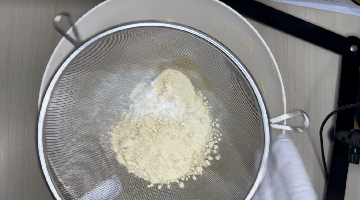 4. 가루를 체쳐서 한번에 넣고 주걱으로 섞어주세요.
