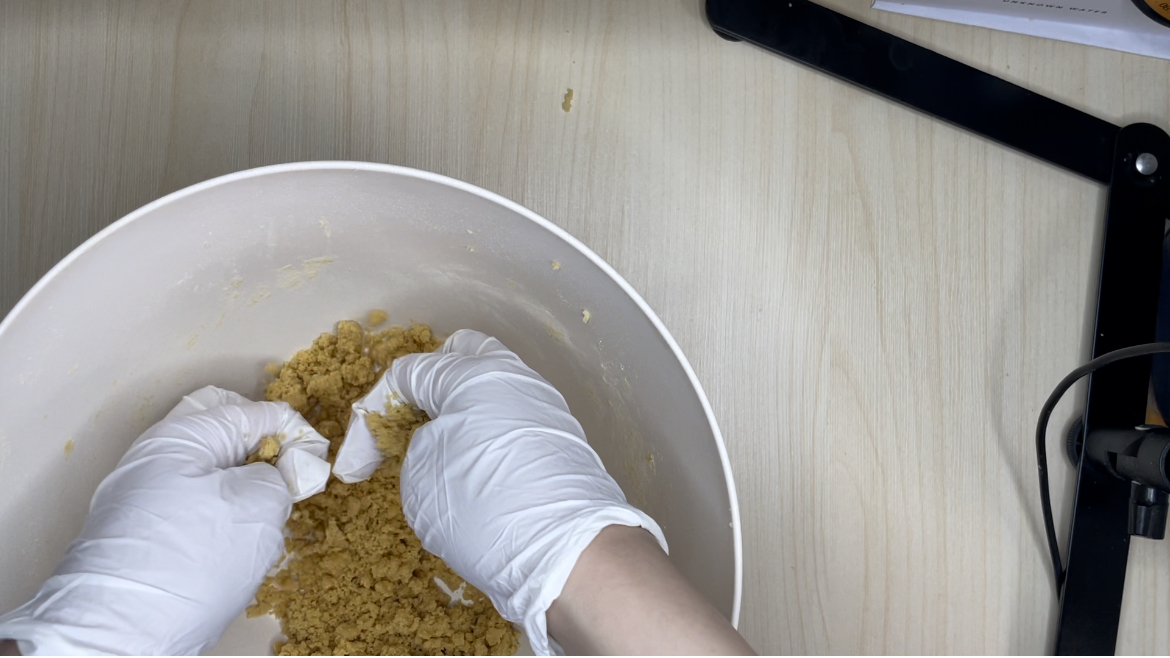 3. 가루 넣고 주걱으로 섞다가 손으로 비비면서 크럼블 상태로 만들어줍니다.