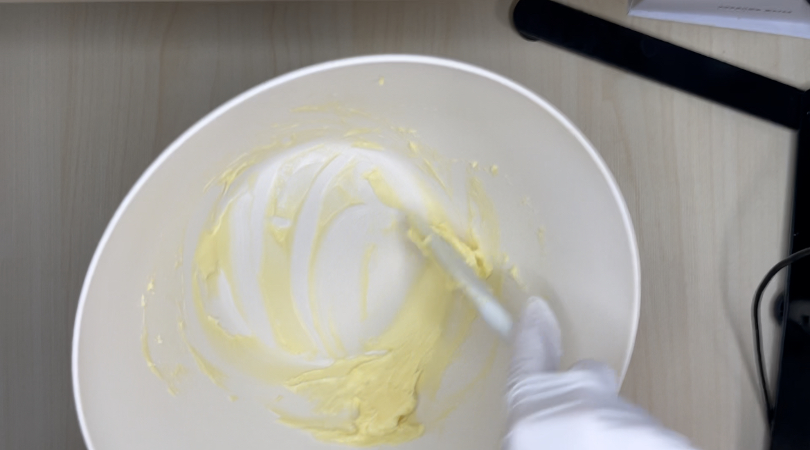 2. 설탕을 넣고 색깔이 뽀얘질때까지 휘핑기로 충분히 섞어주세요.