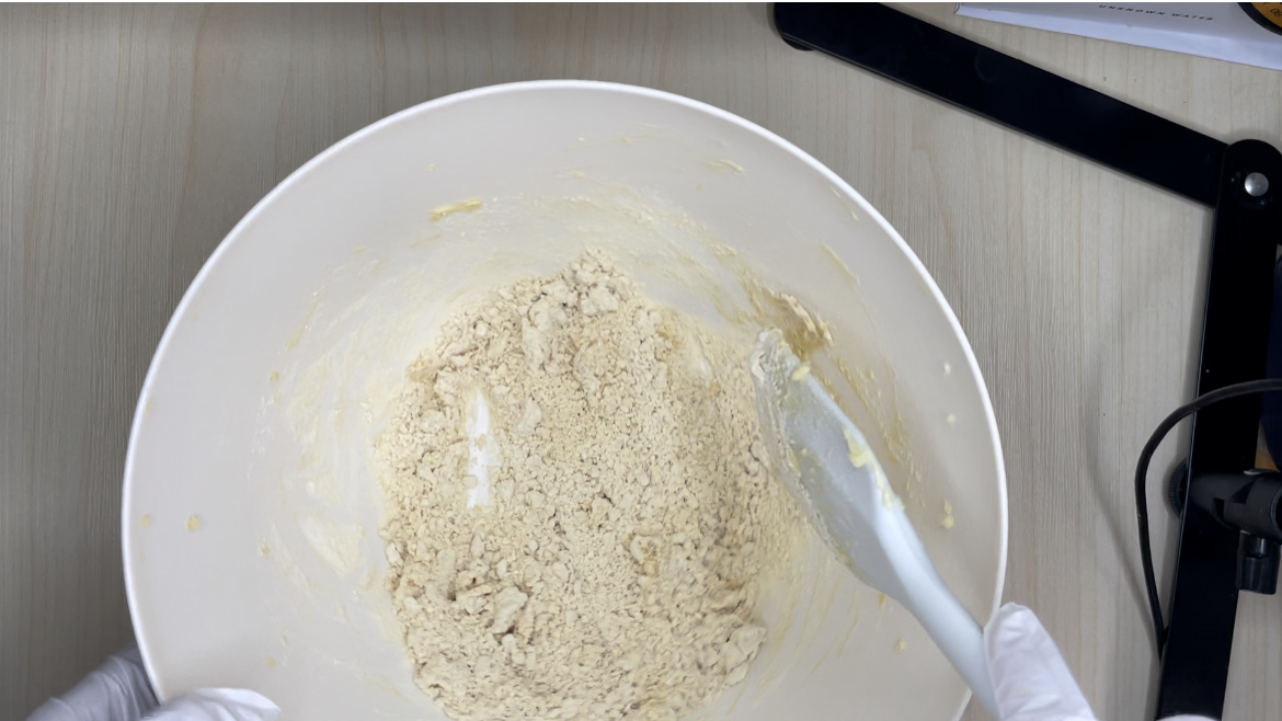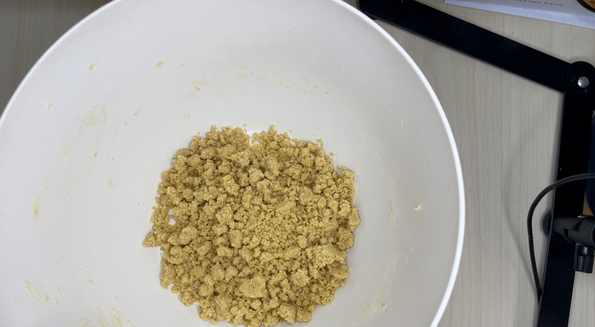 3. 가루를 체쳐서 넣고 주걱으로 섞다가 손으로 비비면서 크럼블 상태로 만들어줍니다.