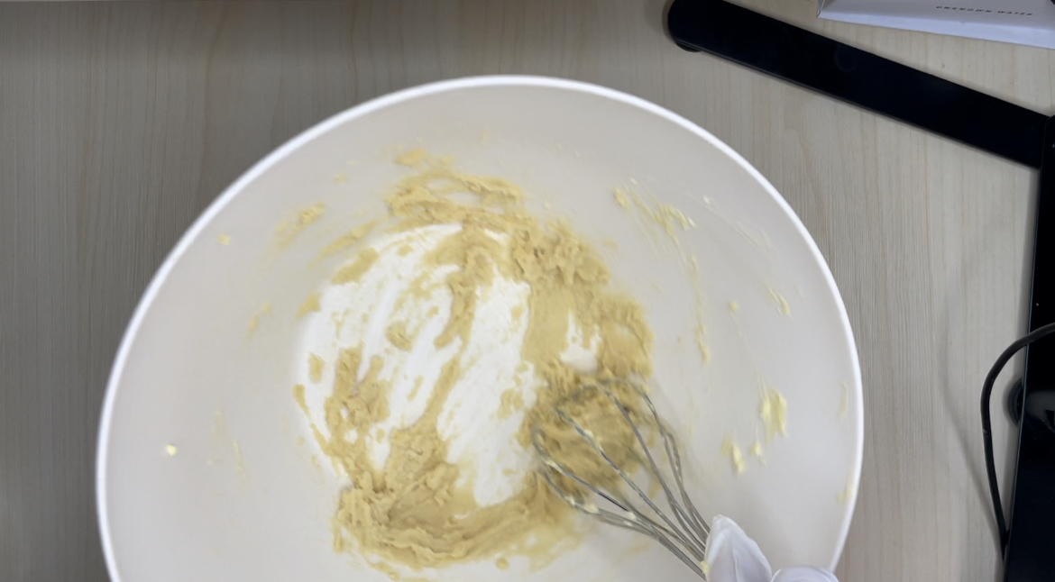 3. 계란을 조금씩 넣으면서 휘핑기로 섞어주세요.