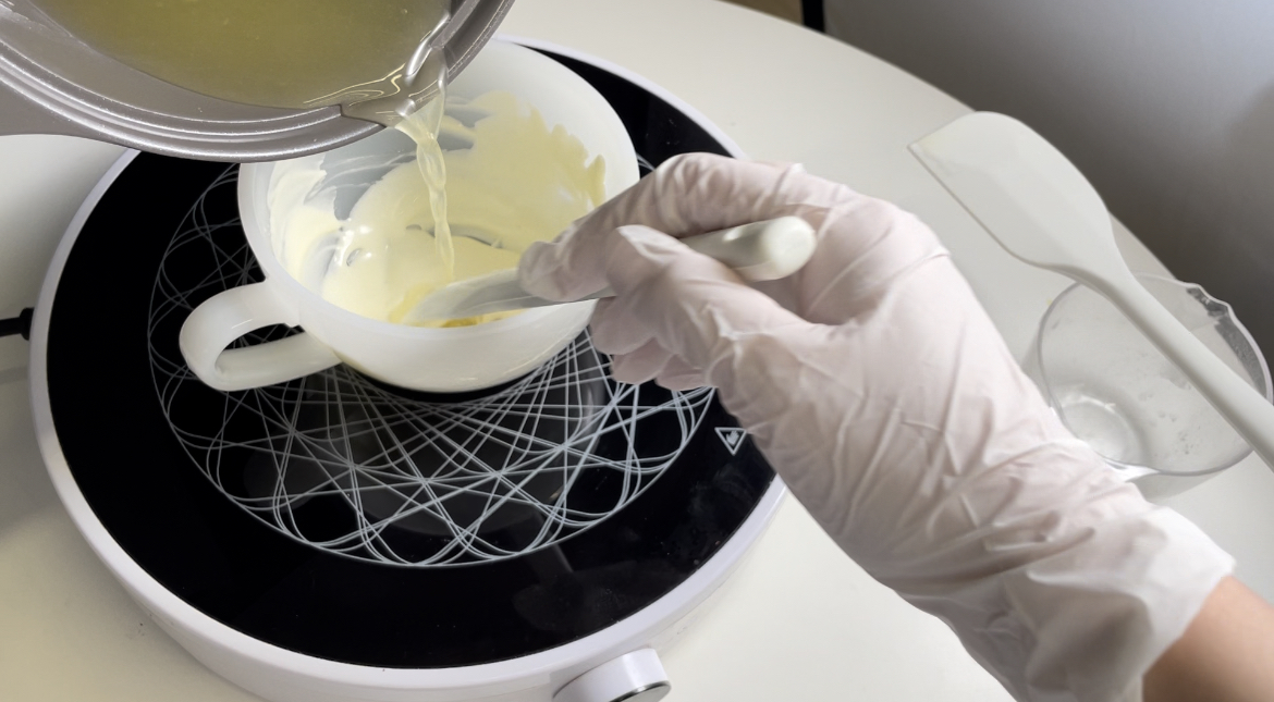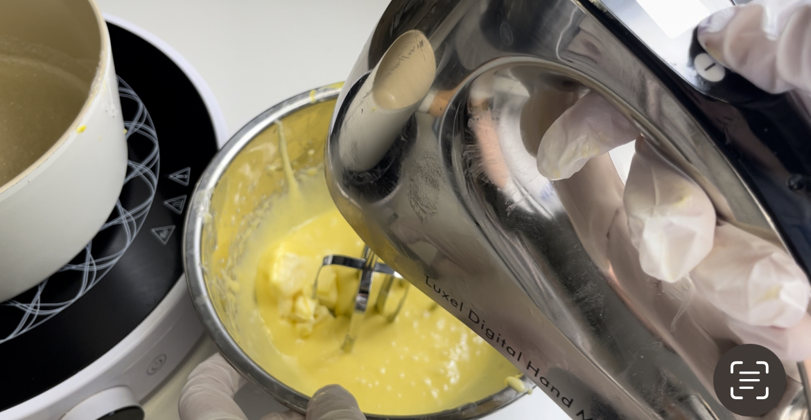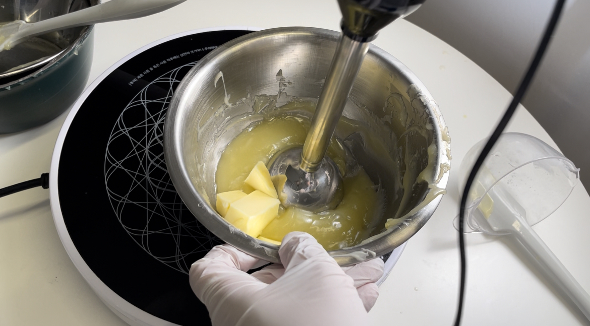 6. 온도가 45도까지 내려가면 남은즙과 말랑한 버터를 넣으면서 핸드블랜더로 매끄러운 크림이 될때까지 섞어줍니다.