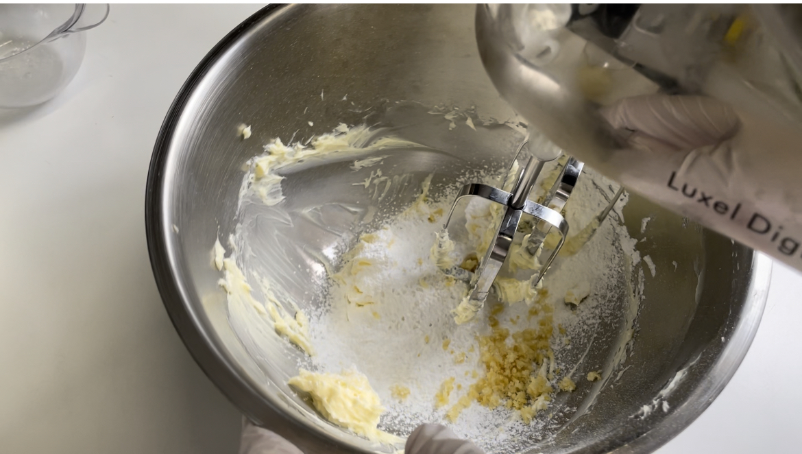 2. 체친 슈가파우더, 소금, 레몬제스트 넣고 저속으로 가볍게 섞어줍니다.