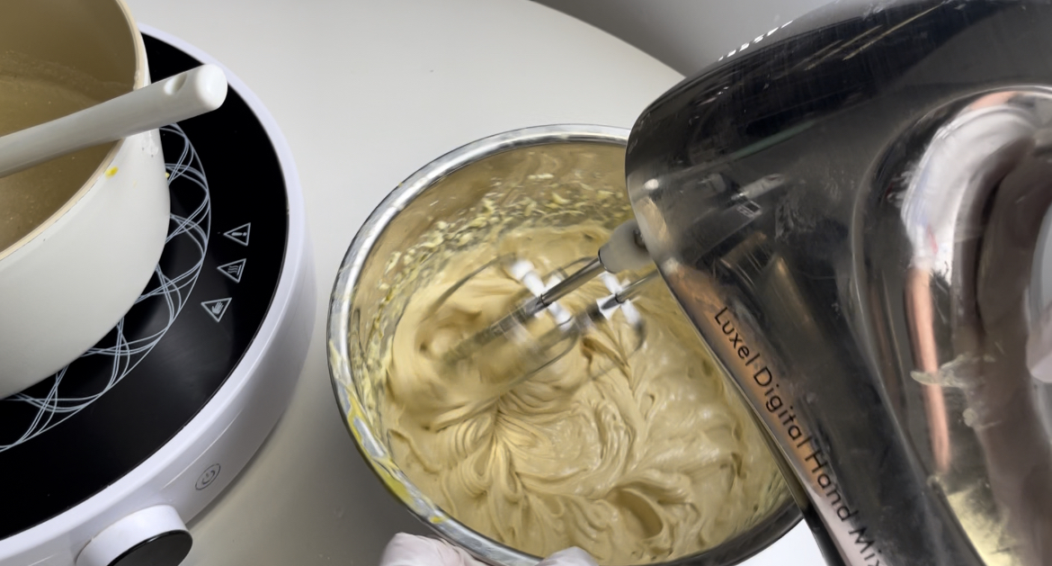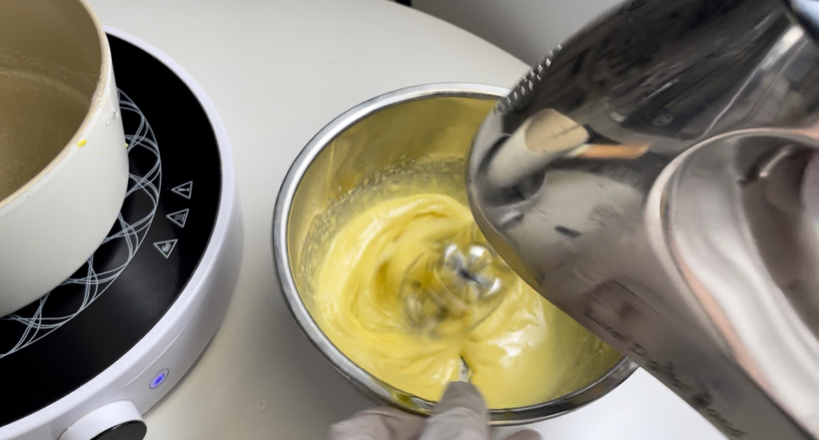 4. 핸드믹서의 속도를 높여서 40도정도로 식을때까지 세게 돌려줍니다.