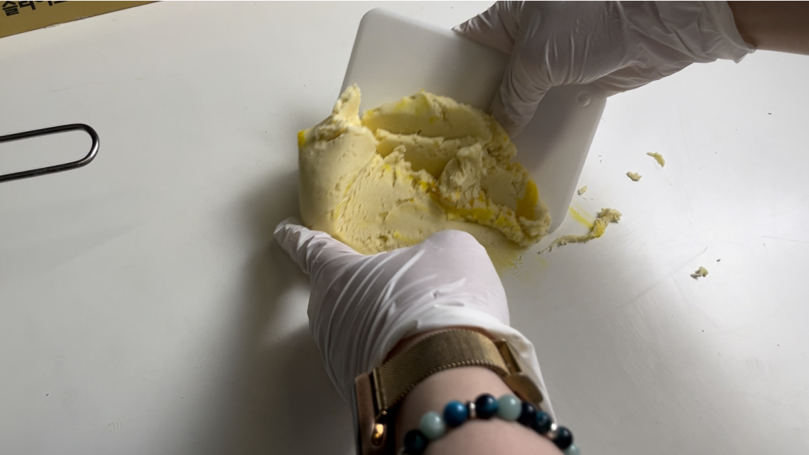 (반죽이 말랑해지지 않게 찬상태 유지(냉동실에 왔다갔다 하면서 반죽 단단한 상태 유지))