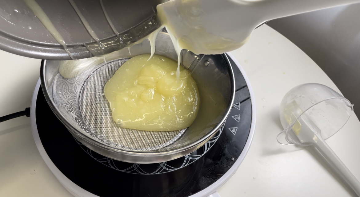 5. 녹인 화이트초콜릿볼에 체에 걸러서 잘 섞어줍니다.